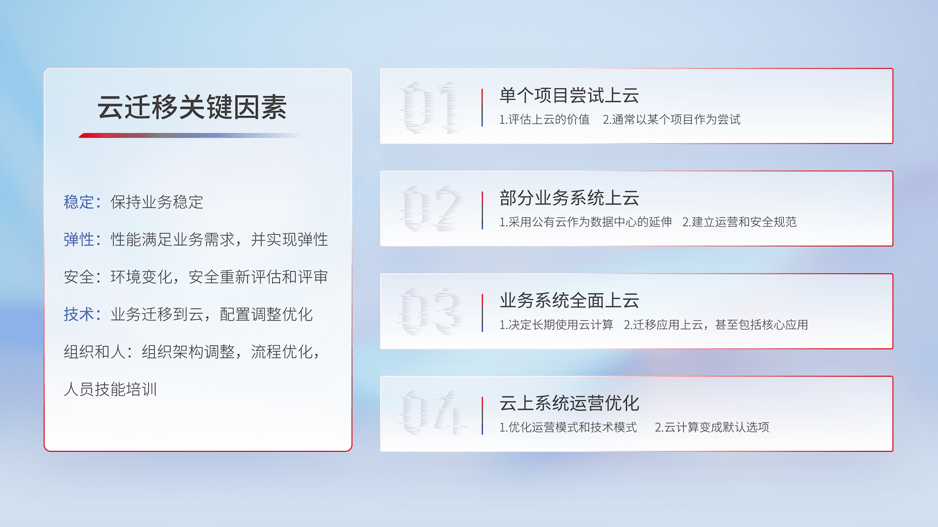 结合实际业务,,,,从规划设计、、、云平台选型、、、、云原生改造、、、数据迁移、、、、集成交付,,,迁移全过程为客户识别最佳上云路径,,,,做好风险识别管理,,,设计网络架构、、身份权限、、、安全审计合规、、、、操作审计、、日志审计、、、、监控告警策略、、、多站点容灾设计等,,,,对云上基础设施进行整体规划,,提升IT治理水平,,,以满足弹性、、、高可用、、、、高性能的需求。。。。