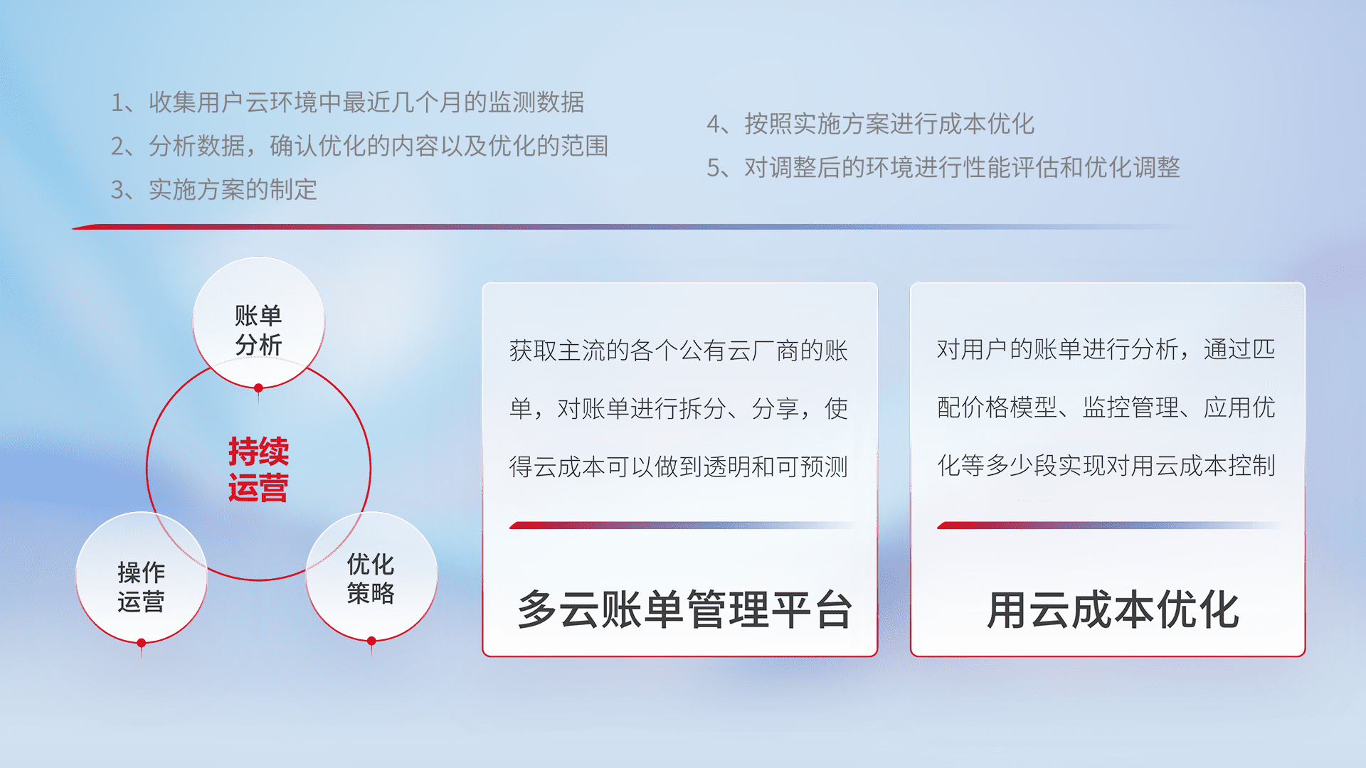 通过多云纳管,,,,以统一的资源数据模型把客户的云资源进行抽象和封装,,进而实现对多云资源的统一操作,,,保障云资源管理的可靠性、、、稳定性与可用性。。。。量身定制化运维内容,,配置、、开发运维、、、、补丁管理、、、、备份、、、、监控、、、认证和访问管理、、、、审计和日常巡检等,,,保障在用云过程中的可靠度,,稳定度以及高可用率。。